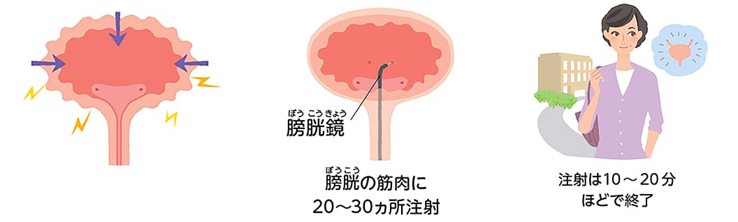 治療には膀胱鏡を使用し、異常な収縮が生じている膀胱の筋肉に、細い針で20~30ヵ所、直接薬を注射します。